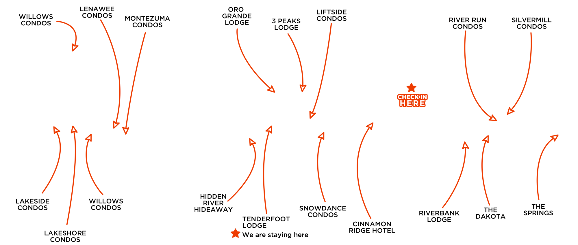 The most convenient area to stay will be in the Keystone Ski Resort. This is where shuttles will pick up and drop off wedding guests, as well as the River Run area which is the central location for bars, restaurants, shopping and activities.